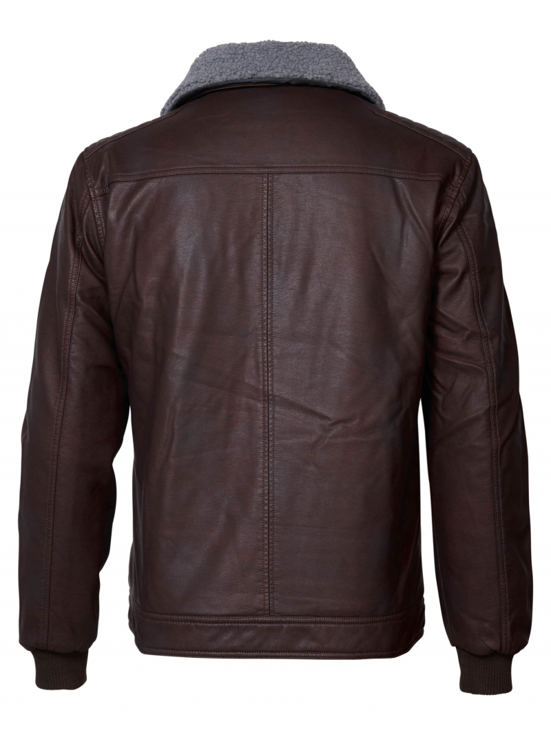 Jaqueta de pell sintètica amb folre encoixinat, butxaques amb cremallera, punys a les mànigues, una butxaca interior i coll revestit amb "borreguito" que és desmuntable.